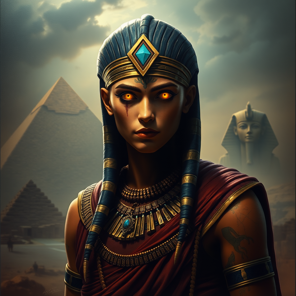 A highly detailed depiction of a mysterious Egyptian figure with luminous eyes stands prominently against the backdrop of ancient pyramids. The scene is captured in a photorealistic cinematic style, exuding a sense of awe and mystique. Dramatic lighting highlights the intricate skindentation and ornate details of traditional Egyptian attire, creating a masterpiece of visual storytelling. The painting, reminiscent of a well-executed cinematic still, melds realism with an enigmatic atmosphere, inviting the viewer to delve deeper into the secrets of an ancient world.