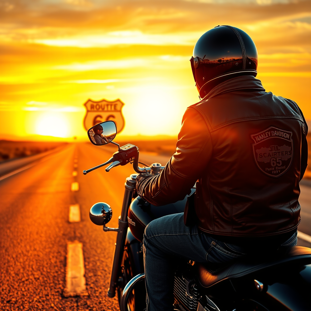 A highly detailed depiction of a rugged biker riding a Harley Davidson motorcycle along the iconic Route 66, drenched in the warm hues of a breathtaking sunset, captured from a side view. The biker's leather jacket and helmet reflect the golden light, with the road stretching ahead, flanked by open landscapes. The shadows cast by the fading sun add depth and drama, while the chrome of the motorcycle gleams, enhancing the nostalgic yet adventurous atmosphere of this classic American journey.