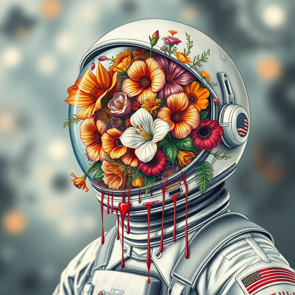 A highly detailed depiction of an astronaut surrounded by an explosion of vibrant flowers within their helmet, reminiscent of an anatomical drawing with elements of dripping paint. The design incorporates a striking coquelicot color against a blurred depth of field background, capturing a surreal and artistic blend of science and nature in a narrow 9:16 aspect ratio, emphasizing quality and intricate detail.