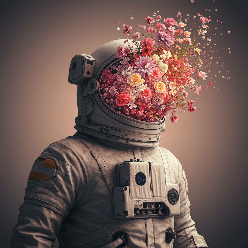 A highly detailed depiction of an astronaut surrounded by a vibrant explosion of flowers within their helmet, incorporating elements of anatomical drawing and flowing paint in rich coquelicot hues. The scene is captured with a dreamy depth of field, emphasizing the surreal blend of science and nature against the elongated 9:16 canvas.