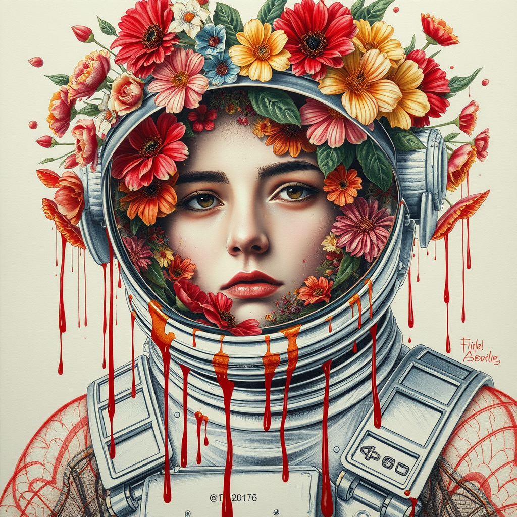 A highly detailed depiction of an astronaut with a helmet bursting with vibrant flowers, blending seamlessly into anatomical drawings that capture a sense of organic complexity. Elements of dripping paint in shades of coquelicot red add a dynamic and artistic flair to the composition. The depth of field creates a striking focus on the intricacies and contrasts within the piece. The artwork maintains an aspect ratio of 9:16, evoking a sense of vertical elegance and immersive quality.