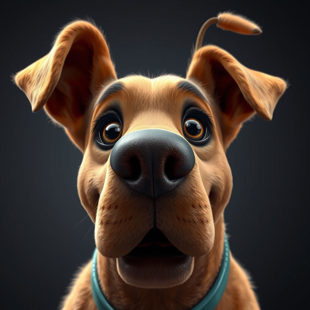 A highly detailed digital art portrait featuring a light brown dog with distinctive features, capturing the essence of Scooby Doo. The image presents a single subject in sharp focus, with dynamic lighting enhancing the lifelike texture of the fur and expressive eyes. This concept art showcases the character's playful yet curious demeanor, bringing the iconic mystery-solving dog to life with ultra-detailed rendering and subtle creative enhancements.