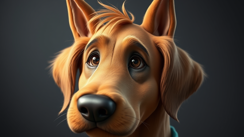 A highly detailed digital art portrait of a light brown-haired dog reminiscent of Scooby Doo, featuring dynamic lighting and sharp focus. The concept art showcases a single subject with ultra-detailed textures and post-processed finishes that highlight the character's playful and curious personality. Small creative touches enhance the classic Scooby Doo essence, adding a subtle modern twist to the beloved canine's iconic look.
