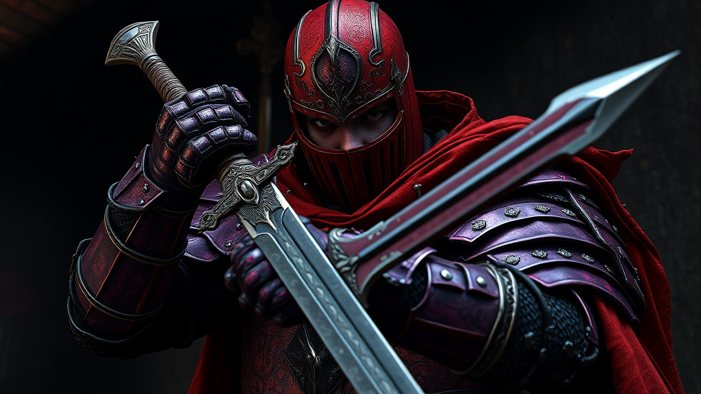 A highly detailed digital art portrait of a medieval knight brandishing a one-handed sword before him, adorned in intricately crafted red and violet armor, exuding an aura of digital realism. The armor is hyper detailed, reminiscent of Dark Souls, nestled within a shadowy medieval backdrop. The atmosphere is steeped in darkcore aesthetics, designed to be a captivating 4k wallpaper, with the quality pushing towards 8k. The scene captures a cinematic essence, with subtle creative tweaks that preserve the spirit of the original concept, introducing unique embellishments that add depth and intrigue to the knight's storied presence.