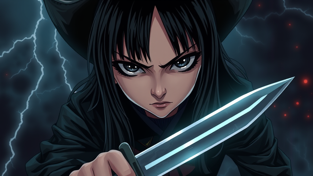 A highly detailed digital illustration masterpiece featuring a character with long black hair, styled with distinct bangs, and dark black eyes giving a piercing glare, set in a cowboy shot perspective. The character holds a short sword menacingly while exuding a grumpy expression. The viewpoint is from above, capturing the front view of this enigmatic figure. It is night with dark ambient lighting, adding to the mysterious atmosphere. The scene is reminiscent of a Wednesday Addams-like persona, with occasional flashes of lightning illuminating the surroundings, enhancing the dramatic effect.