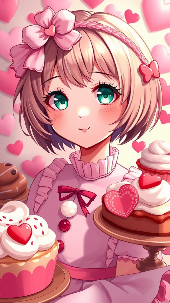 A highly detailed digital illustration of a charming girl with short hair personifying the Valentine holiday, featuring emerald eyes that sparkle with warmth and mischief. She is surrounded by a whimsical array of bakery delights and sweets, reminiscent of Studio Ghibli's enchanting aesthetics. Her attire is imbued with hues of soft pinks and reds, harmonizing with the romantic essence of the day, while subtle elements hint at the artistry of Alexei Vinogradov. The composition is sharp and focused, capturing the magic of the moment, as if curated for an Artstation gallery. Her expression is one of inviting joy, drawing viewers into a world where love is celebrated through delightful confections and an enchanting visual feast.