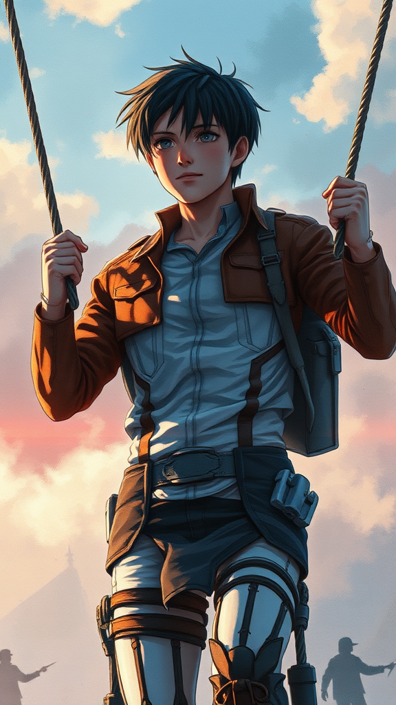 A highly detailed digital illustration of Eren Jaeger from Attack on Titan, capturing a cinematic atmosphere of entrapment and connection, with elements that suggest being tied to the horizon. The composition is centered, showcasing perfect anatomy with a dynamic stance that approaches perfection. The scene is painted in vibrant watercolor style, reflecting the quality of a high-resolution artstation concept art piece. Eren’s figure is contrasted against a backdrop that mixes monochrome and vibrant hues, enhancing the dramatic effect. Creative modifications include subtle influences from diverse cultural backgrounds, introducing hints of 16k HDR in elements reminiscent of a fusion of black African and Chinese features, while maintaining Eren's iconic traits. These adaptations blend seamlessly without compromising the character's essence. The piece avoids negative aspects such as low quality, cartoonish features, and non-realistic elements, ensuring that anatomy, eyes, and facial expressions are rendered with precision and clarity.