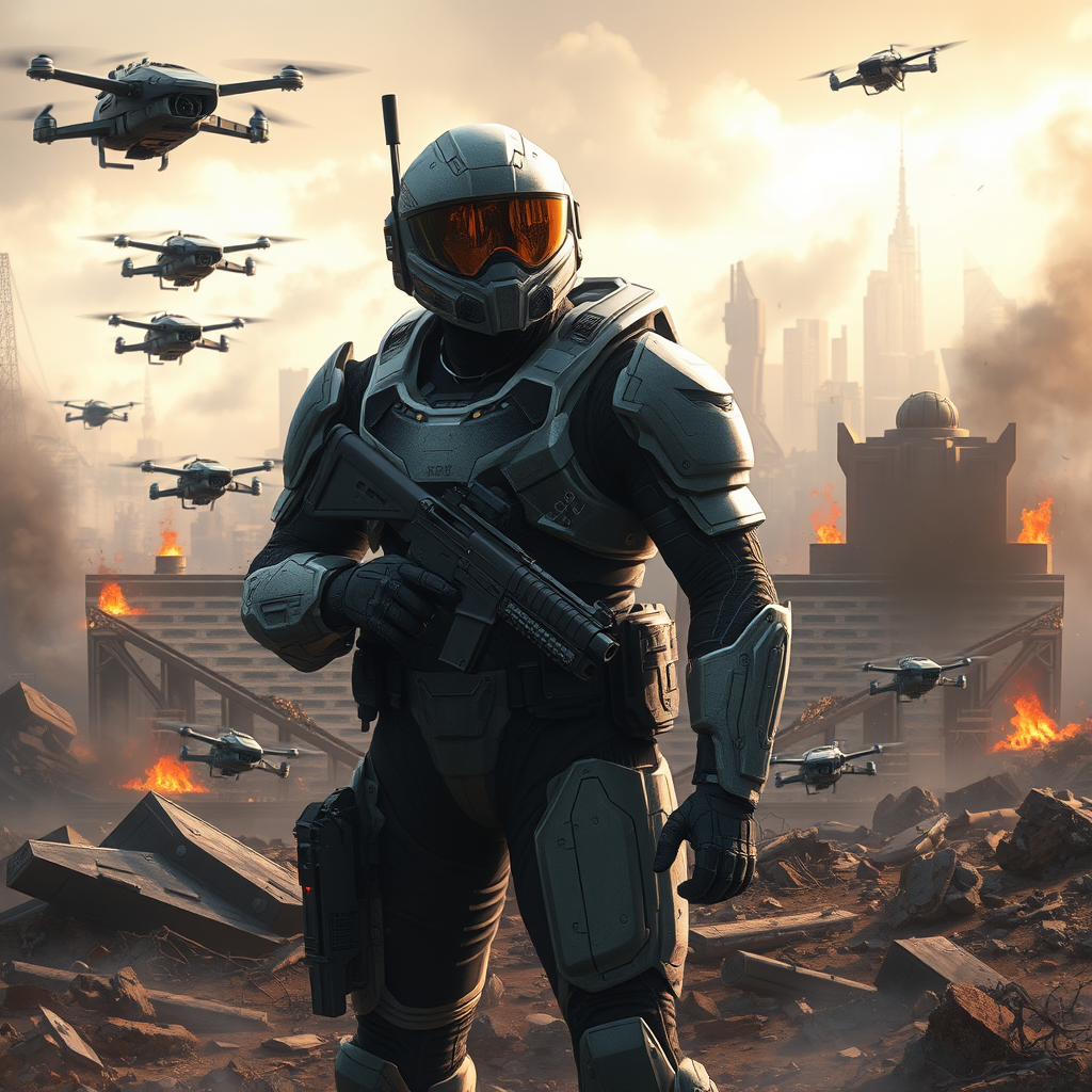A highly detailed digital painting captures a sci-fi futuristic soldier in advanced armor, equipped with cutting-edge weaponry and a sleek, mirrored visor. The soldier stands resilient amidst a war-ravaged battlefield, where hovering drones patrol the smoky air, and fragments of burning wreckage litter the ground. In the distance, the skyline of a futuristic city looms, its architectural marvels shrouded in haze. Dynamic lighting accentuates the dramatic scene, highlighting the soldier's readiness for battle in this ultra-high-definition depiction.