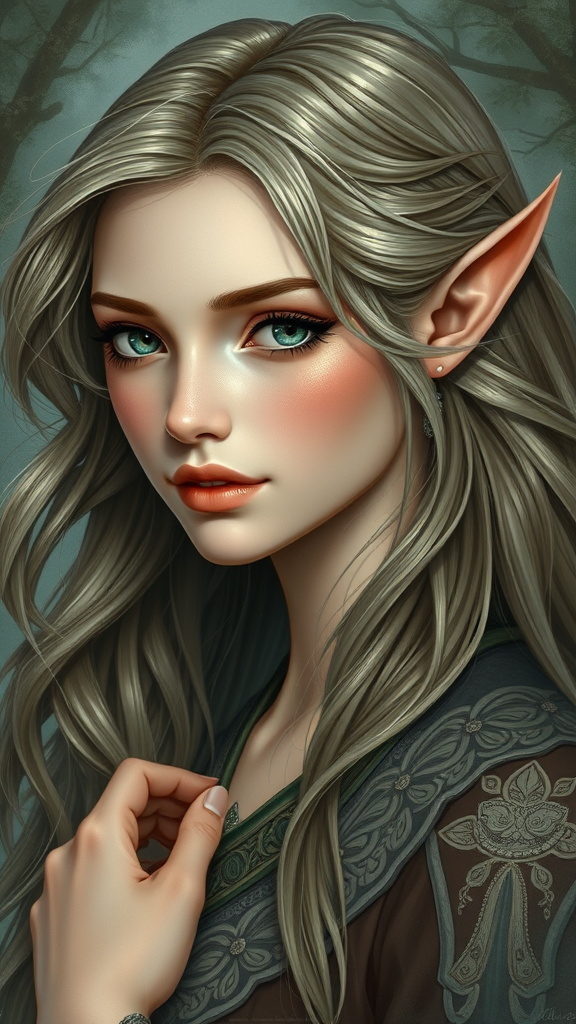 A highly detailed digital painting featuring an elegant female elf with intricate features and a graceful presence, capturing the essence of fantasy art. Her delicate, pointed ears peek through flowing locks of lustrous hair, reminiscent of ethereal beauty. The elf's attire is adorned with exquisite patterns, reflecting both ancient elven craftsmanship and modern fantasy aesthetics. The illustration is sharp and smooth, presented in 8k resolution, with a focus on subtle expression and dynamic pose. The art style harmonizes influences from Artgerm, Greg Rutkowski, and Alphonse Mucha, combining their strengths in concept art and illustration. The composition exudes both a sense of mystery and grace, set against an atmospheric backdrop that complements her otherworldly charm.