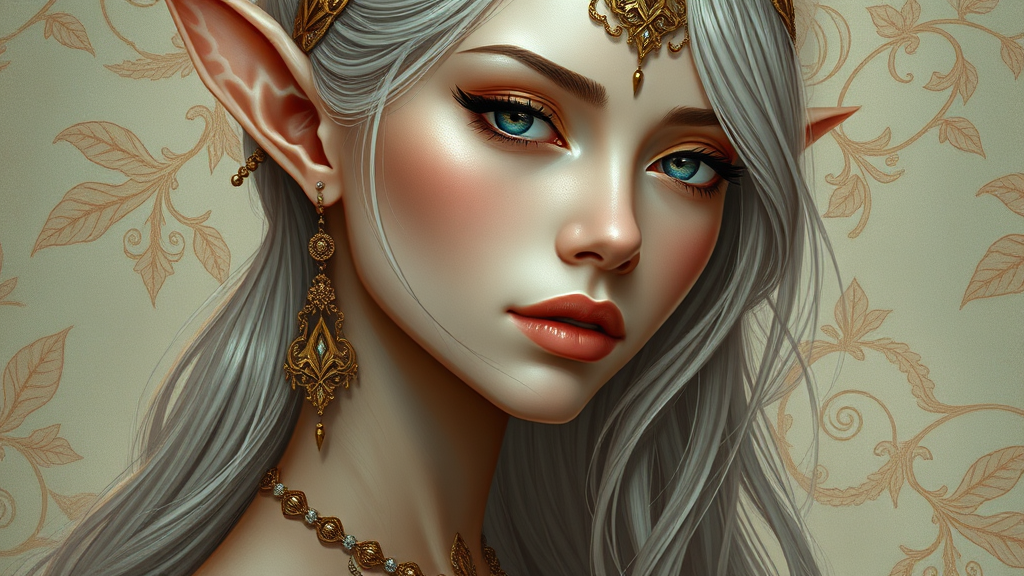 A highly detailed digital painting of a female elf in the mdjrny-v4 style, capturing an intricate and elegant essence. The portrait features smooth and sharp focus, showcasing an artful blend of concept art influences. Inspired by the works of Artgerm, Greg Rutkowski, and Alphonse Mucha, the composition highlights flowing, ornate patterns reminiscent of Mucha’s style. Her ethereal beauty is emphasized with delicate jewelry and nature-inspired elements. The background includes subtle, harmonious colors, enhancing the mythical and otherworldly atmosphere. Rendered in 8k for a stunning, ultra-detailed illustration.