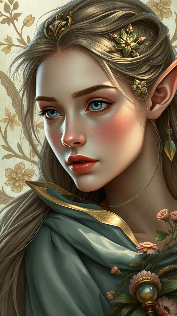 A highly detailed digital painting of a female elf, characterized by intricate and elegant features. The illustration captures the smooth and sharp focus typical of concept art found on ArtStation, drawing inspiration from the works of Artgerm, Greg Rutkowski, and the stylized elegance of Alphonse Mucha. The elf is depicted in an 8k resolution, showcasing delicate facial expressions and flowing garments that emphasize her ethereal beauty. The artwork includes subtle creative enhancements, such as an elaborate, nature-inspired background that complements her mystical presence.