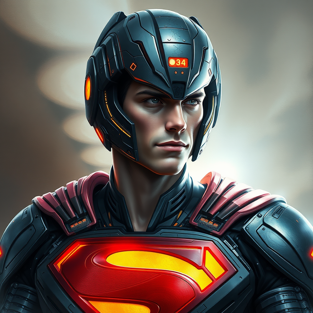 A highly detailed digital painting of a sci-fi Superman in cybernetic heavy armor and helmet, glowing with intricate designs, capturing an elegant full-body portrait with smooth and sharp focus. The illustration embodies the essence of concept art, inspired by the styles of Artgerm, Greg Rutkowski, and Alphonse Mucha, showcasing a futuristic and sophisticated look. The composition emphasizes a refined and flawless anatomy, presenting a heroically poised Superman with a sleek and powerful presence, maintaining a clean aesthetic without any distortion or visual errors.