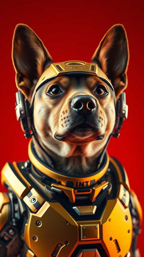 A highly detailed dog portrait in an alert pose, inspired by cyberpunk style, featuring a bionic helmet and armor reminiscent of Iron Man. The armor is a blend of golden tones with chrome accents, set against a brightly contrasted red and yellow background. Rendered with octane for ultra-realistic textures and depth. The image captures the essence of the dog's character while ensuring a focus on realistic anatomy and seamless integration of cybernetic elements. Background elements are vivid and enhance the futuristic theme, maintaining clarity and focus on the dog as the central figure, avoiding common artistic errors and distortions to deliver a cohesive, photorealistic representation in 8k.