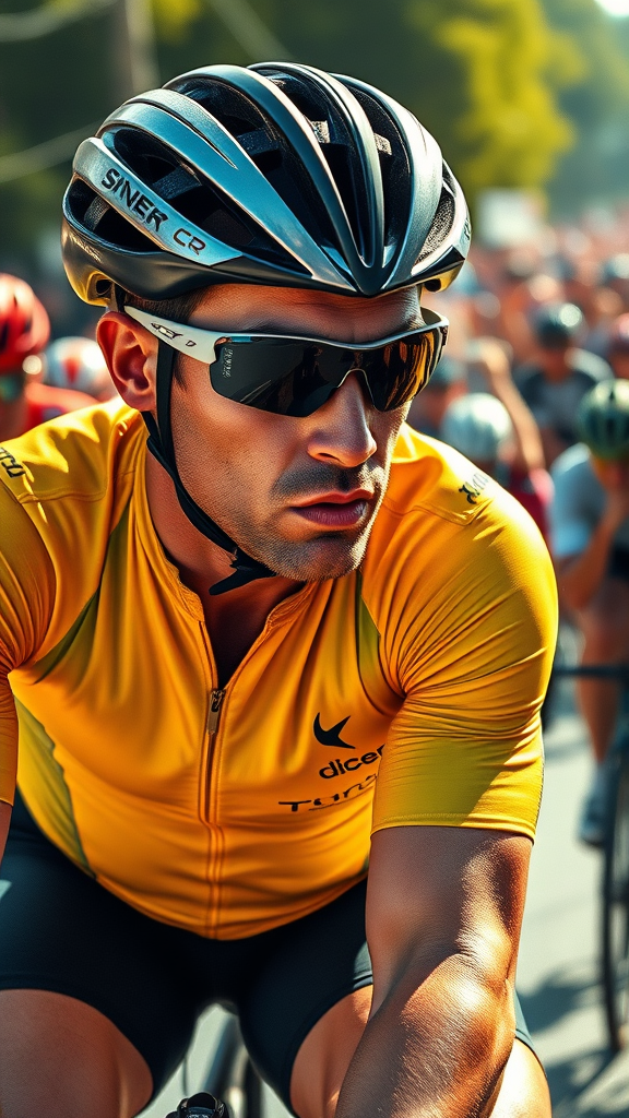 A highly-detailed drawing capturing the essence of a prestigious Sports Illustrated cover photo focused on the Tour de France. The central figure, an athlete wearing the iconic Yellow Jersey, rides with intense determination and focus. His muscles are taut, and the strain of the competition is visible on his face, embodying the spirit of intense athletic competitions. Sunlight glints off the cycling helmet and sweat-drenched jersey, adding a dynamic sheen to the photorealistic image. In the background, the blurred outlines of fellow cyclists and cheering crowds add depth and motion, suggesting the rush and excitement of the race. The scene is vibrant, yet the competitive tension remains palpable, with a slightly elevated artistic style to enhance the intensity and grandeur of the moment.