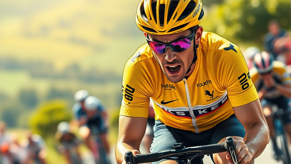 A highly-detailed drawing capturing the essence of a Sports Illustrated cover photo featuring the Tour de France winner in the Yellow Jersey, showcasing the intensity and passion of athletic competition, the cyclist is depicted with a determined expression as sunlight glistens off the sweat on their forehead, the background shows blurred cheering crowds and lush green landscapes, adding subtle creative touches like the subtle imprint of chain grease on the cyclist's leg and a small patch of dirt on the bike, emphasizing realism with intricate details of the fabric's texture and the vibrant colors of the jersey, overall, the scene is a dynamic blend of motion and emotion, embodying the spirit of perseverance and triumph in the style of photorealistic athletic art, under an aspect ratio of 1:2 with a stylized twist.