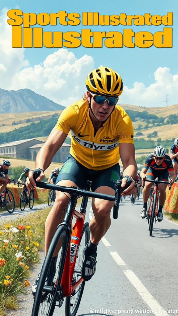A highly-detailed drawing of a Sports Illustrated cover photo featuring a cyclist in the Tour de France wearing the Yellow Jersey, capturing the intense athletic competition in a photorealistic style, set against the backdrop of iconic French countryside with a dynamic sense of motion and energy, emphasizing the athlete's determined expression and muscular effort, incorporating subtle creative elements like a slight breeze blowing through the wildflowers by the roadside and a hint of spectators cheering in the distance, all rendered with vivid colors and dramatic lighting.