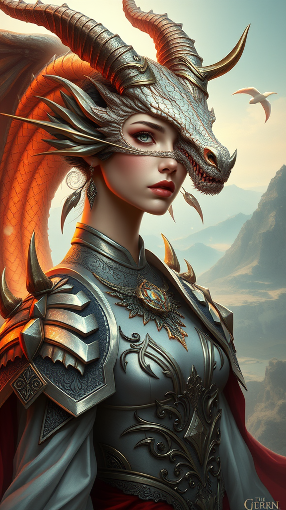 A highly detailed, elegant digital painting in the style of mdjrny-v4 featuring a female draconian character. The portrait emphasizes intricate, smooth, and sharp focus elements with influences from ArtStation concept art. Inspired by the iconic works of Artgerm, Greg Rutkowski, and Alphonse Mucha, the image captures the regal and mythical essence of the character. The draconian's features include luminous scales with a subtle iridescent glow, horns gracefully arching back over her head, and eyes shimmering with wisdom. Her attire is elaborate, combining ancient armor and flowing robes that accentuate her otherworldly grace. The background is a soft, out-of-focus landscape that complements her striking presence without distraction. The overall artwork is designed to be visually captivating, drawing the viewer into an ethereal and fantastical realm.