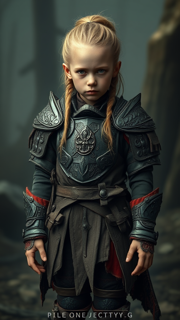 A highly detailed full body concept of a little Viking warrior girl in intricate armor, set in a dark, dystopian world, inspired by plague-era art. The scene portrays her as a biomutant with soft, flowing textures and oil painting aesthetics, emphasizing micro-detail. Rendered with octane-level precision, the composition features a mysterious, otherworldly atmosphere. The girl stands confidently, showcasing Nordic patterns and designs. Her expression carries a sense of resilience and determination. The color palette is subdued, with deep, muted tones that enhance the somber mood. Soft focus elements add depth, while the background is slightly abstract, suggesting a world in disarray. Despite the bizarre and surreal nature, there is a strange beauty in her form, with unique features that hint at an otherworldly origin. Her clothing is tattered yet intricate, blending traditional Viking motifs with a futuristic twist. The overall image is captivating and enigmatic, a blend of historical fantasy and otherworldly intrigue.