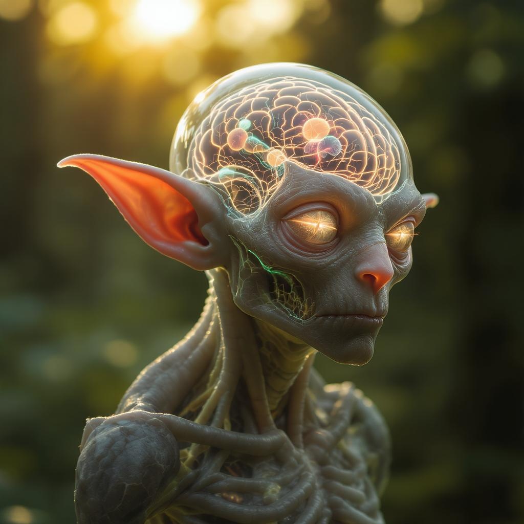 A highly detailed full body portrait of a Dungeons & Dragons goblin with a translucent glass head, revealing a visible brain with intricate biological details and natural textures. The goblin's alien anatomy features bioluminescent hues that shimmer under a golden hour light. Its transparent glass-like skin blends seamlessly with the forest backdrop, casting delicate reflections of foliage. The scene is captured in ultra high definition with sharp DSLR focus, highlighting every captivating detail of the goblin's form. The brain's structure and the goblin's unique skin possess the complexity of microscopic life viewed up-close, set against the blurred, vibrant greens of a leaf-filled forest.