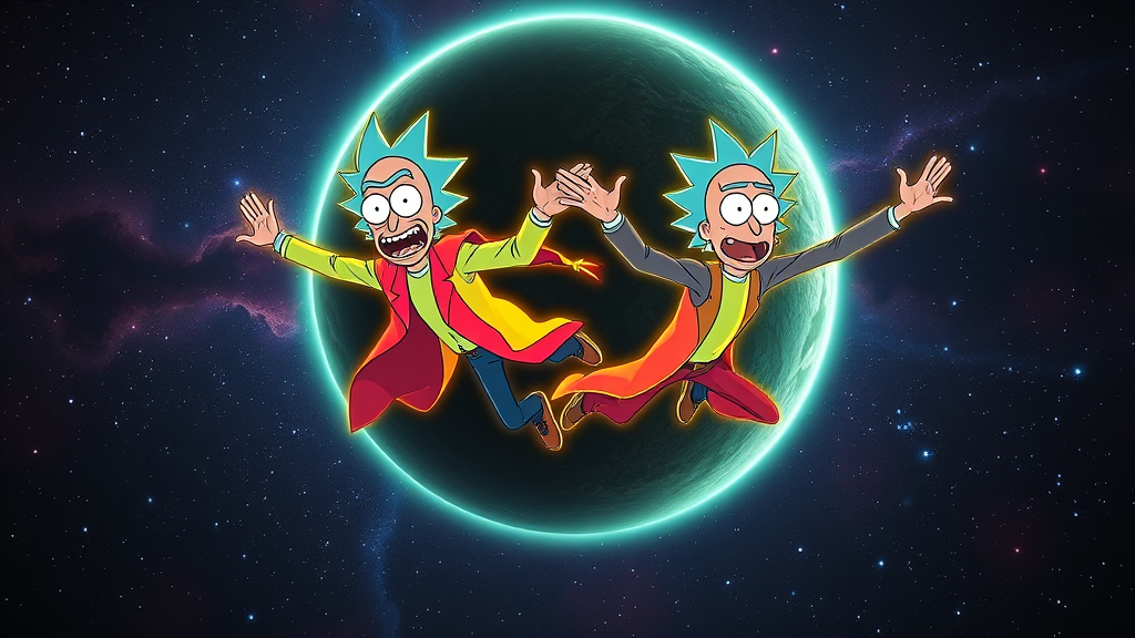 A highly detailed full body portrait of movie characters Rick Sanchez and Morty depicted as gods soaring through the cosmos. They are flying majestically in front of an enormous, magical planet, exuding an aura of power and divinity. Their features are strong and defined, with clothing that befits their god-like status in vibrant, glowing neon colors that illuminate the dark space around them. The scene is captured with the precision and clarity of a Hasselblad H4D 200MS Digital Camera, utilizing a Mitakon Speedmaster 65mm f/1.4 XCD lens. The backdrop is a mesmerizing galaxy with a dimensional effect, accented by spectacular Fresnel lighting that enhances the ethereal atmosphere.