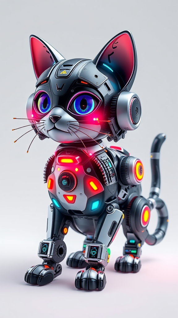 A highly detailed, futuristic cyberpunk cat with a cute mechanic aesthetic, crafted in Blender and enhanced with Unreal Engine. The scene features volumetric lighting highlighting intricate mechanical parts and neon accents against a crisp white background, with a touch of creative flair giving the cat expressive, animated eyes and a playful tail.