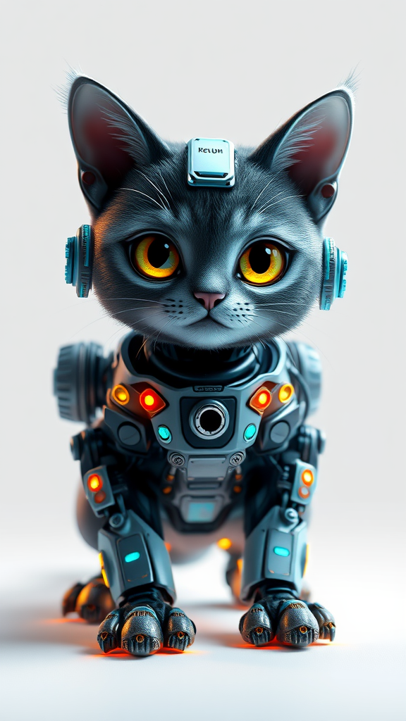 A highly detailed futuristic cyberpunk mechanic cat with cute features, designed using Blender and Unreal Engine, surrounded by vibrant volumetric lighting. The scene features intricate mechanical elements and glowing accents on the cat, set against a clean white background. The cat embodies a playful yet tech-savvy demeanor, with bright eyes and tiny robotic tools integrated into its paws. This depiction captures the essence of a futuristic world where technology and charm are seamlessly intertwined.