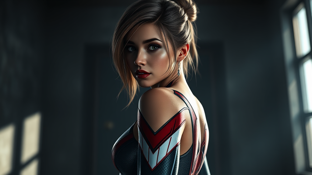 A highly detailed half-body portrait of a female as Spider-Gwen with an alluring and confident pose, highlighting her curvaceous form. The scene is set in a shadowy room with cinematic lighting that casts dramatic shadows, enhancing the depth of field. This concept art is rendered with ultra-realism using advanced techniques, resembling an Unreal Engine 5 and RTX production, providing a photorealistic visual experience with intricate textures and lifelike detail.