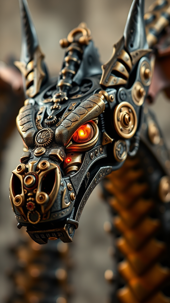 A highly detailed headshot of a steampunk robotic dragon, showcasing intricate gear patterns and metallic textures, with glistening brass and copper elements, set against a soft, blurred background to emphasize the sharp focus and studio lighting. Its eyes glow with a fiery luminescence, exuding an aura of intelligence and power. The scales are meticulously designed, featuring a combination of burnished metal and vintage clockwork components, capturing the essence of advanced steampunk craftsmanship. This trending art piece on ArtStation is rendered in ultra-high-definition with HDR effects, providing an 8K resolution that accentuates every detail and nuance of this imaginative creation.