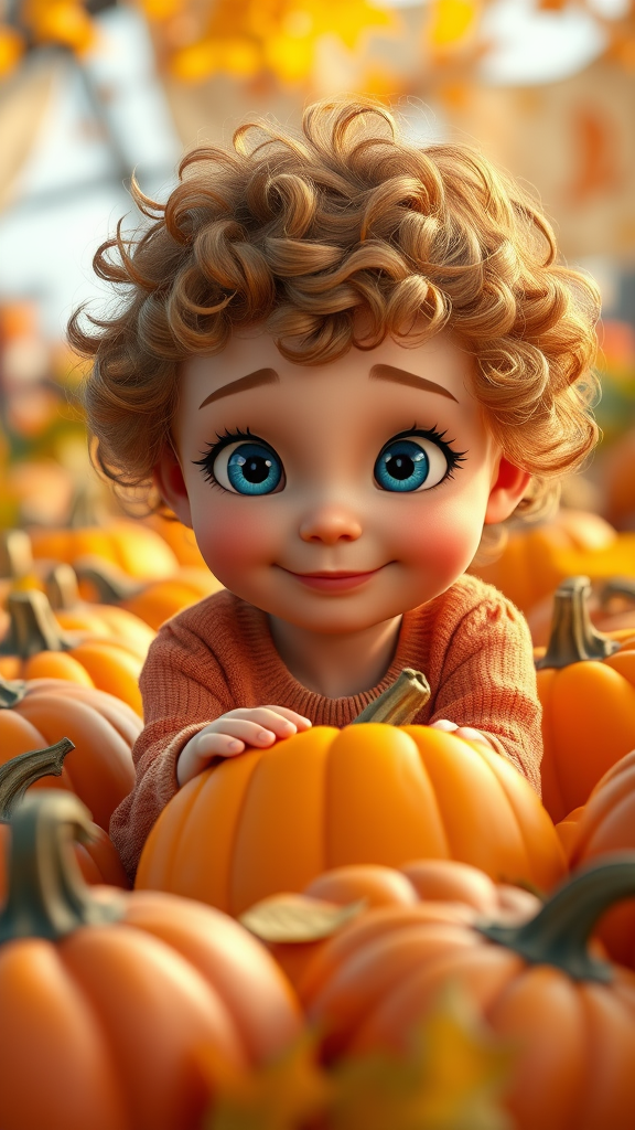 A highly detailed, heartwarming scene from a 3D animated Disney-Pixar-style movie featuring an irresistibly cute young girl with short, bouncy, light brown curly-wavy hair, playfully exploring a vibrant pumpkin patch. Her enchanting, oversized blue eyes light up with wonder and joy, perfectly complementing her clear, beautifully rendered face that showcases her youthful innocence and charm. The setting is infused with cozy autumn vibes, complete with rich, warm hues of orange and gold. An ultra-high-definition 8k image using octane render and unreal engine captures the magic of fall, as fallen leaves and glistening pumpkins envelop the scene in an enchanting, fairy-tale atmosphere.