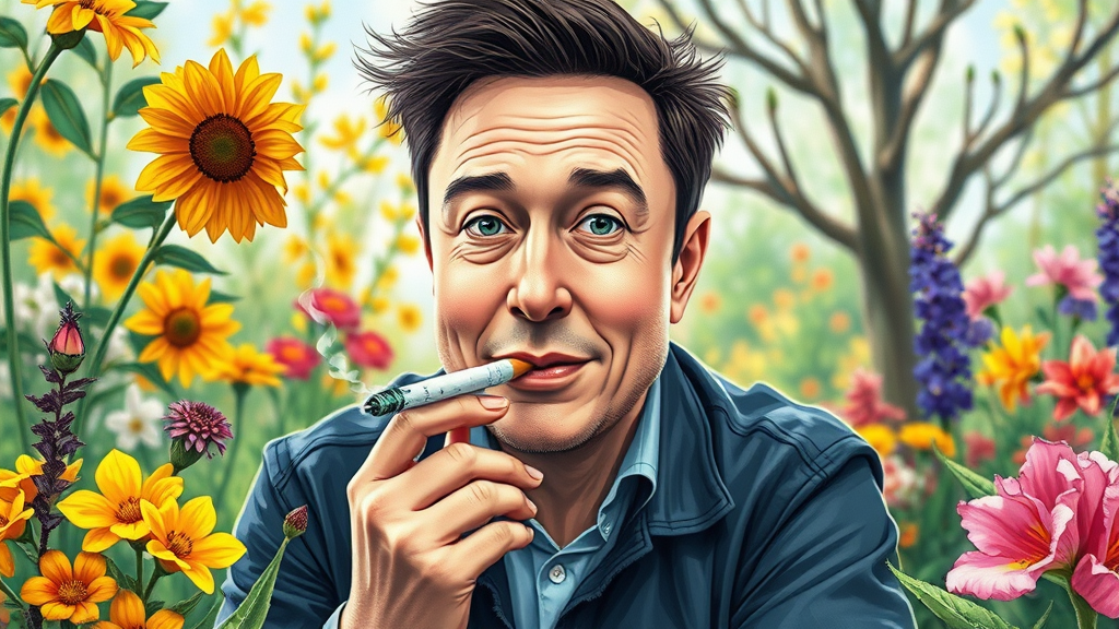 A highly detailed humorous illustration of Elon Musk enjoying a blunt in his garden during springtime. The setting is vibrant and colorful, with a caricature style capturing Elon in eye contact with the viewer. The artwork features a mix of bright colors, paint splashes, and ink strokes. It's a digital piece that blends fine art with exaggerated pencil strokes. The scene is centered in the frame but playfully incorporates creative elements like tiling patterns, quirky distortions, and humorous anatomy with extra limbs, slightly disfigured features, and body parts slightly out of frame. The effect is a playful blur of vibrancy and whimsy, including elements like poorly drawn hands and feet for comedic effect, and a touch of graininess for texture.