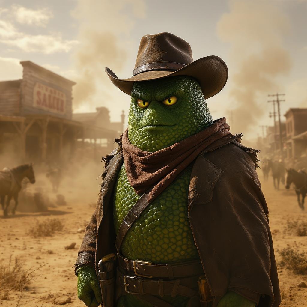 A highly detailed, hyper-realistic 8k cinematic image captures a desperado portrayed as an anthropomorphic avocado, complete with a rugged cowboy hat and weathered leather duster, standing defiantly in a dusty wild west town. The avocado's textured skin glistens under the harsh sun, casting long shadows on the parched earth. The scene is bustling with tension as tumbleweeds roll by and horses tied to the hitching posts snort impatiently. In the background, the wooden facade of a saloon teeters under the weight of years, while a faint wind stirs up clouds of fine dust, setting the stage for an epic showdown.