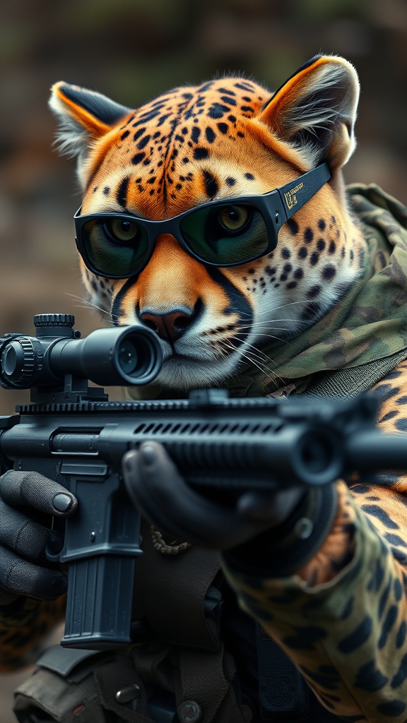 A highly detailed, hyper-realistic depiction of an anthropomorphic cheetah in expertly crafted camouflage and tactical sniper gear, wielding a precision sniper rifle. The cheetah's face exudes intelligence and focus, with striking features highlighted in ultra-high-definition quality and cinematic lighting. Its sleek, spotted fur blends seamlessly with the environment, showcasing its mastery of stealth. The overall scene is presented in an upright 9:16 aspect ratio, capturing the tension and anticipation of a marksman deep in concentration.