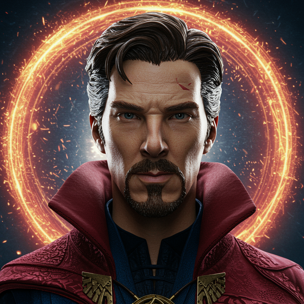 A highly detailed hyperrealistic photograph portrait of Doctor Strange, featuring cinematic lighting and intricate details, with a subtle blur effect to enhance depth. The composition presents a stoic expression on Doctor Strange's face, surrounded by an aura of mystery. In the background, a luminous and swirling portal adds an otherworldly dimension, casting dynamic reflections and shadows across the scene. The overall image embodies the grandeur and immersive quality of an 8k cinematic experience, enhanced by the advanced rendering techniques reminiscent of Unreal Engine.