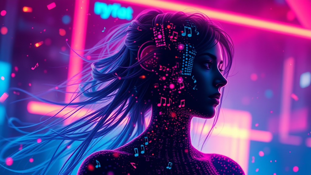 A highly detailed illustration depicting the ethereal silhouette of a woman, resembling a mystical figure. Enveloped in vibrant neon lights and colorful particles, the image embraces the vivid hues of CMYK colors. The scene is backlit with a cyberpunk aesthetic, featuring soft yet naturally volumetric cinematic lighting. The figure appears ghostly, with motion blur and a fragmented body depicted through mosaic-like body fragmentation. Spheres seem to break off from her face, bleeding into mechanical segments. Floating parts are intricately detailed in 8k resolution, captured with Octane render to achieve a masterpiece-quality scale. The composition benefits from a beautiful depth of field, showcasing an ultra-wide perspective with ultra-detailed CG elements. Dynamic lighting creates amazing shadows, enriched with vibrant colors and dramatic atmospheric lighting. The air is filled with an ecstasy of musical notes, visible as streaming visuals that enhance the ambiance. This HDR masterpiece captures a compelling mix of light and sound in a visually stunning narrative.