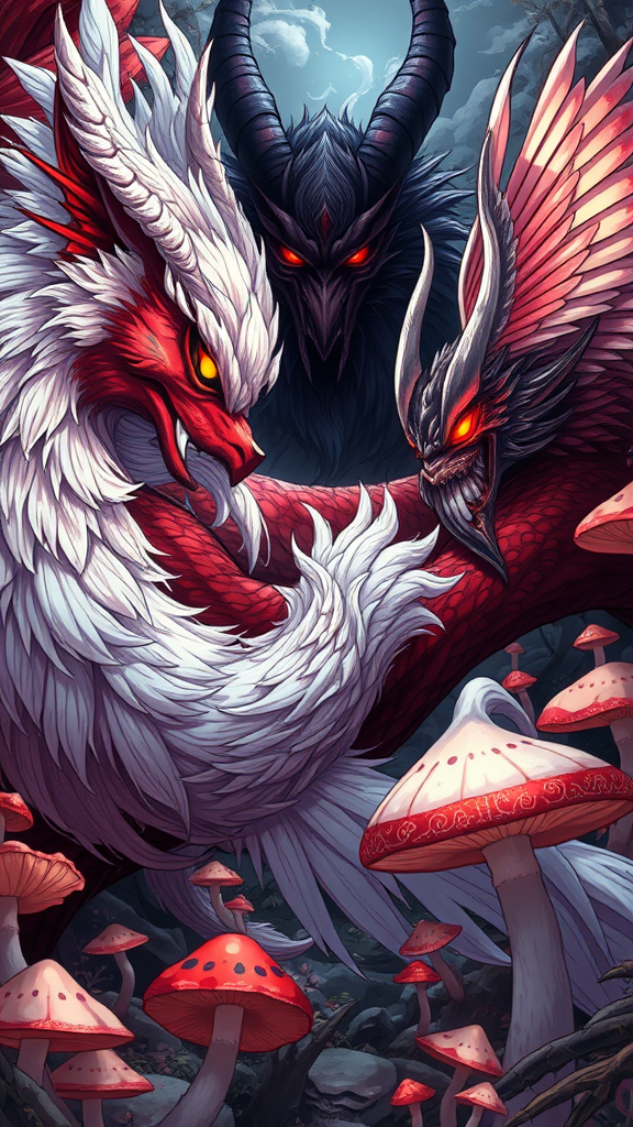 A highly detailed illustration in anime style featuring a captivating scene where a kitsuné with flowing silver fur interlaces gracefully with a menacing Oni whose skin is textured with deep crimson hues. Nearby, a shadowy Nué with its chimeric form emerges, its eyes glowing with an otherworldly light. A vigilant Tengu, with its sharp, feathered mask and wings that shimmer with ethereal colors, stands watchfully in the background. The composition is set amidst my funji decor, where intricate fungi references bring a whimsical touch with mushrooms of different shapes and sizes accentuating the mystical atmosphere. The setting is enriched with dynamic lighting and a vivid, high-definition palette, making every creature and element pop with surreal lifelike details.
