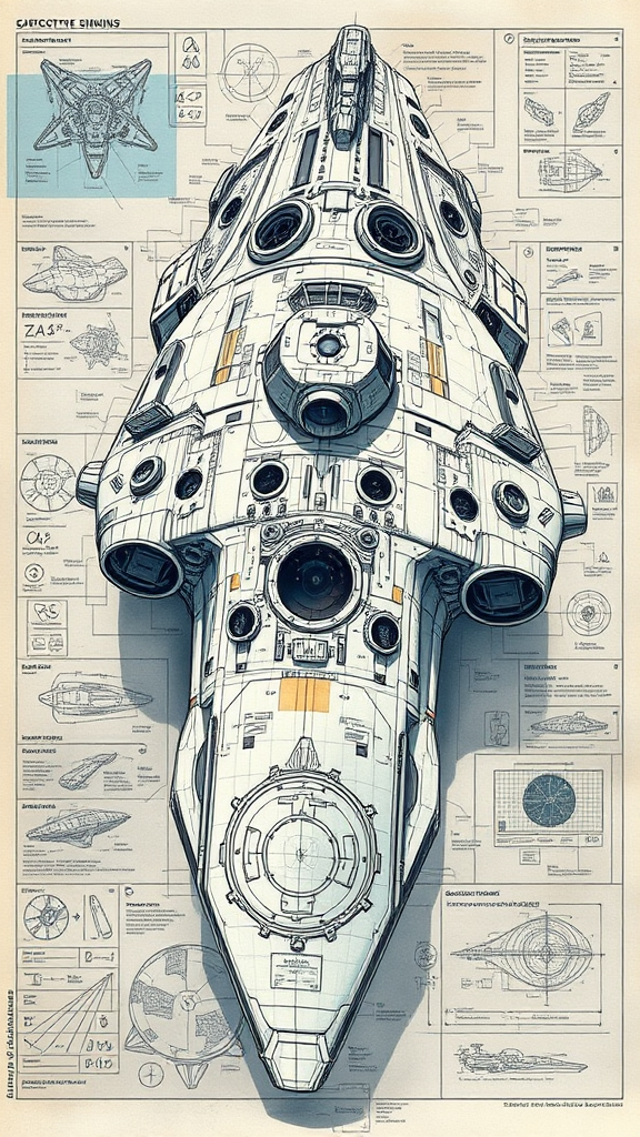 A highly detailed illustration of a futuristic sci-fi spacecraft, featuring intricate sketches and blueprints of its massive structure and warp engines. The design includes scientific formulas and annotations, with schematic breakdowns by individual parts, subtly incorporating the golden ratio into the layout for harmonious proportion. There are imaginative elements and fictitious details to enhance the intrigue. The artwork embraces a trending Pixiv Fanbox appeal, using an acrylic palette knife technique. The style is a fusion of Makoto Shinkai's ethereal atmosphere, Studio Ghibli's imaginative world-building, the vibrant aesthetics of Genshin Impact, and the distinctive touches of James Gilleard, Greg Rutkowski, and Chiho Aoshima.
