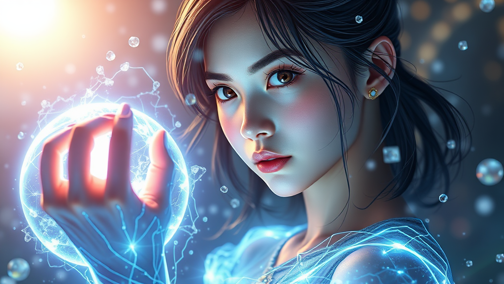 A highly detailed illustration of a young woman, inspired by award-winning designs, holding a vibrant electric energy sphere. The scene features numerous clear crystals and particles, reminiscent of a 3D Dragon Ball Z aesthetic, with extreme attention to detail. The composition is cinematic, enveloped in ambient lighting akin to Unreal Engine and Octane renders. Presented in an ultra-high-definition 16k resolution, the artwork boasts HDR quality. The character has faint, ethereal features, with a captivating gaze and an aura of power. The setting is immersive, promoting a sense of magical realism, while avoiding imperfections such as extra limbs or distorted elements. The composition remains clean without cropping issues or digital artifacts, focusing on a seamless visual experience.