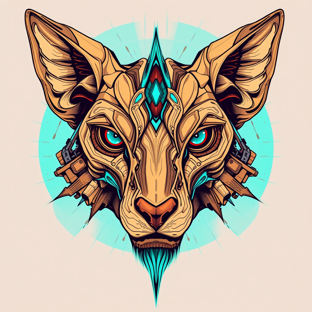 A highly detailed illustration of an abstract head with animallike features, inspired by futuristic cyberpunk, blending influences from artists like James Jean and Jeff Danziger, with a color palette of light brown and cyan. The design showcases symmetrical balance, capturing intricate line work and textures, echoing the style of Aykut Aydogdu. The head features a harmonious fusion of organic and mechanical elements, highlighting a visionary and otherworldly presence, with small creative modifications enhancing its originality while maintaining the core concept.