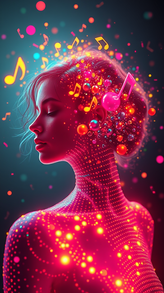 A highly detailed illustration showcasing the light silhouette of a woman, an ethereal and phantasmagorical figure with neon lights and vibrant, colorful particles. Using CMYK colors, the image is backlit and embodies a cyberpunk aesthetic. The figure is enveloped in a soft, natural, volumetric cinematic light, resembling a ghostly presence. With a dynamic motion blur, her fragmented body parts create a mosaic-like effect, where spheres break off from her face, giving an impression of bleeding mechanical fragmentation. The image is rendered in high detail, with floating parts captured in 8k using octane rendering, resulting in a masterpiece of art. It has a beautiful depth of field, an ultra-wide perspective, and dynamic lighting with amazing shadow work. The vibrant colors and dramatic lighting create an atmospheric scene. Musical notes stream visibly around her, creating an ecstasy of sound and sight, all captured in vivid HDR quality.