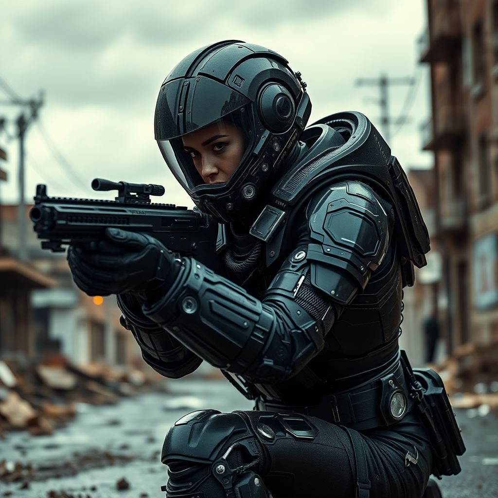 A highly detailed image of a black female warrior adorned in futuristic battle armor, featuring intricate cybernetic enhancements and a sleek helmet with a sci-fi visor. Her bald head is partially visible beneath the helmet, and she is poised on one knee, weapon aimed with precision. The armor reflects a blend of plate and insulated design elements typical of an advanced spacesuit, showcasing an array of intricate details. Set against the backdrop of a ruined city street under an overcast sky, the scene captures a sci-fi movie atmosphere with photorealistic textures and natural lighting. The mood is enhanced by a cinematic use of blur effect and long exposure, creating a sense of dynamic motion within a third-person perspective. The overall visual presentation is rendered in 8K Ultra-HD, using ray tracing to achieve the highest quality and detail, with moody and cinematic lighting enhancing the intense, immersive experience.