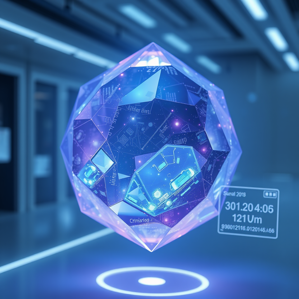 A highly detailed image of a futuristic crystal with intricate facets, glowing with ethereal blue and purple hues, emitting a gentle luminescence. The crystal's surface is smooth and reflective, showing an array of shifting patterns and micro-circuitry embedded within. It hovers gracefully in an advanced, sterile laboratory setting, surrounded by sleek, minimalist technology. The ambient light enhances the crystal's radiance, creating a sense of mystery and wonder, while faint holographic displays float nearby, providing data analysis on the crystal's unique properties.