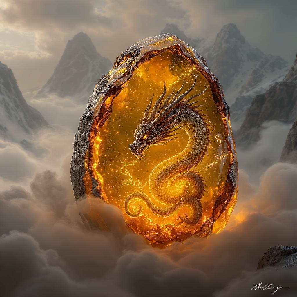 A highly detailed image of a majestic dragon emerging from a piece of amber, emanating a soft, magical glow amidst swirling cinematic fog, captured in ultra-sharp detail. The dragon is bathed in an ethereal light that illuminates its scales, set against a breathtaking, epic landscape that enhances the scene's mystical allure. This award-worthy photograph is rendered with unmatched clarity, inspired by the powerful visual capabilities of contemporary rendering technology.