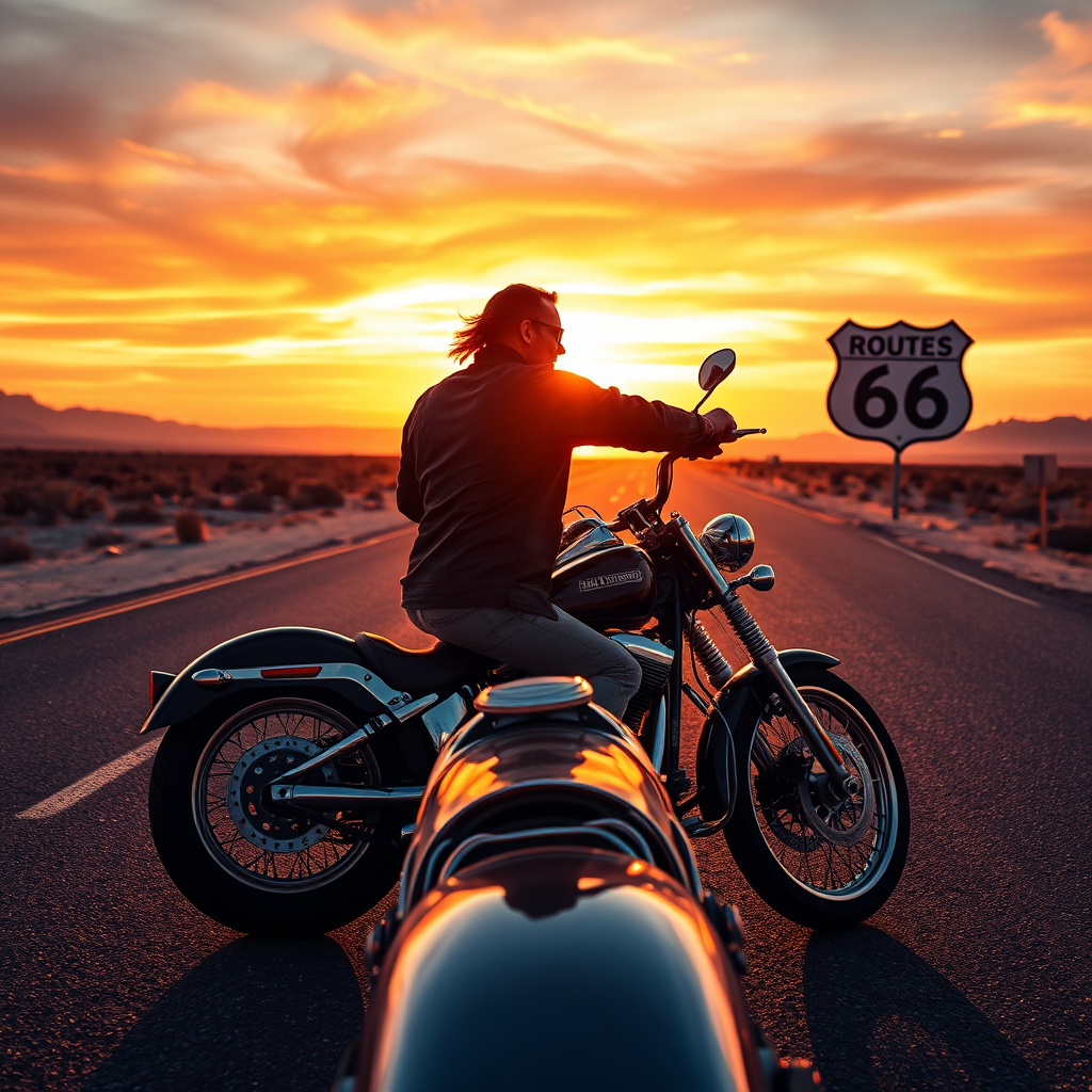 A highly detailed image of a rugged biker cruising on a classic Harley Davidson motorcycle, set against the iconic Route 66 during a breathtaking sunset. The view is from the side, highlighting the silhouette of the biker and the gleaming chrome details of the motorcycle, all under a sky painted with rich hues of orange, pink, and purple. The road stretches infinitely, evoking a sense of freedom and adventure, with the desert landscape softly fading into the horizon.