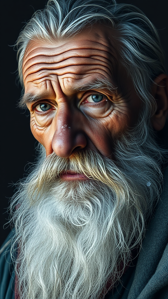 A highly detailed image of a weary, aged fisherman with a long white beard against a dark, textured backdrop. His face, etched with lines and grooves, tells stories of the sea, exuding wisdom and resilience earned through years battling nature's elements. His deep-set eyes, though tired, shine with a quiet strength and understanding of life's cycles. flecks of salt crystal caught in his beard glisten subtly, echoing a life spent by the ocean's embrace.