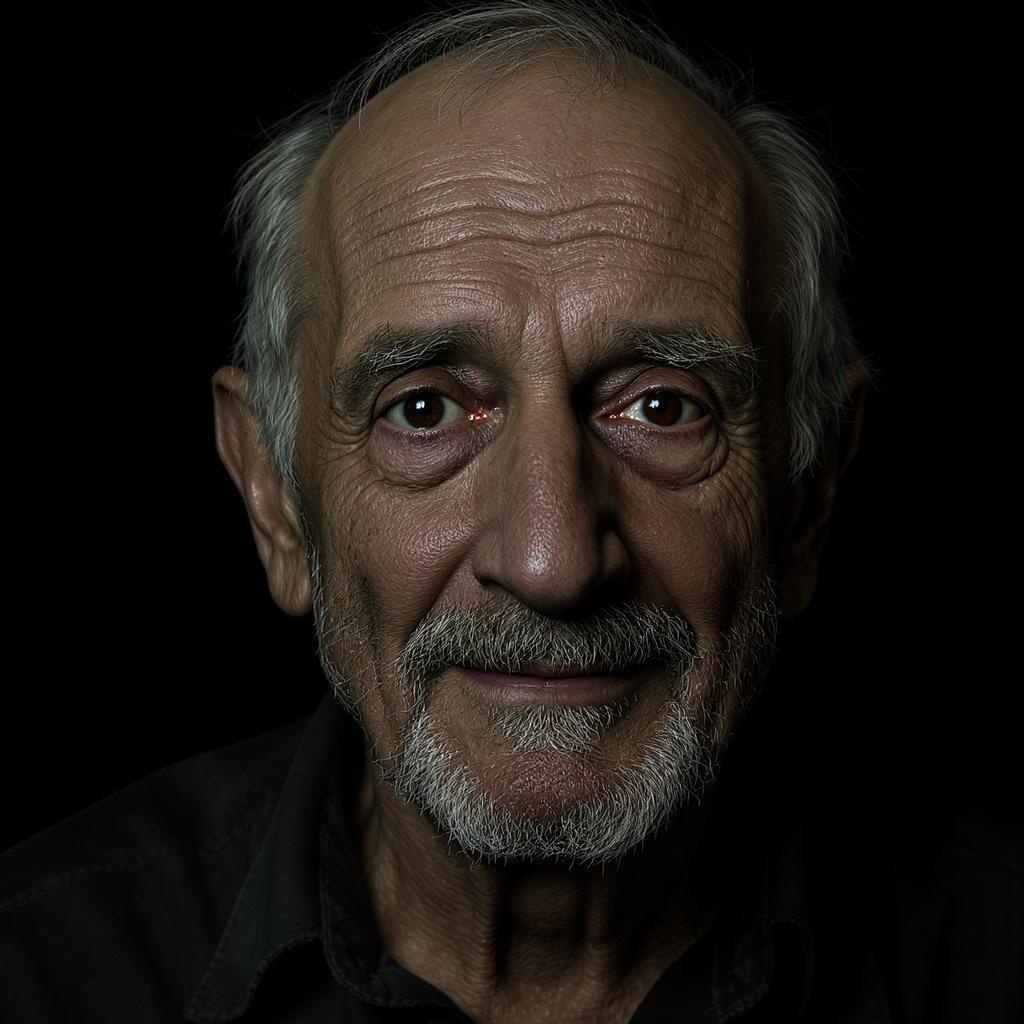 A highly detailed image of a weary, elderly man with a textured face that tells stories of enduring wisdom and the passage of time, set against a deep black background that highlights his features and adds a sense of depth. His eyes, although tired, shine with profound insight, and his slightly furrowed brow and gentle smile suggest a lifetime of experiences. The intricate details of his skin and the soft shadows cast over his visage emphasize his journeys and the narrative etched into the lines of his face, creating a powerful portrait of resilience and knowledge.