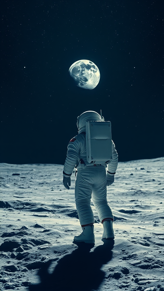 A highly detailed image of an astronaut standing on the lunar surface under a starry sky, the scene bathed in a cool blue and grey color palette with soft highlights, the lunar landscape stretching into the distance with sharp clarity, the astronaut gazing towards the Earth with serene determination, his suit reflecting the subtle hues of the moon's surface, adding an air of solitude and wonder.
