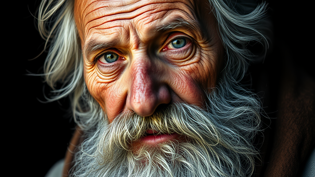 A highly detailed image of an elderly fisherman with a weathered face and a long, flowing gray beard, set against a dark background. His eyes sparkle with the wisdom of years, telling silent stories of the sea's trials. The wrinkles etched into his skin speak of countless days spent battling the elements, while his firm, yet gentle expression exudes a quiet strength and resilience. Wisps of his hair catch the faint light, adding to the textured depth of the portrait, which captures not just a man, but a lifetime of experiences.