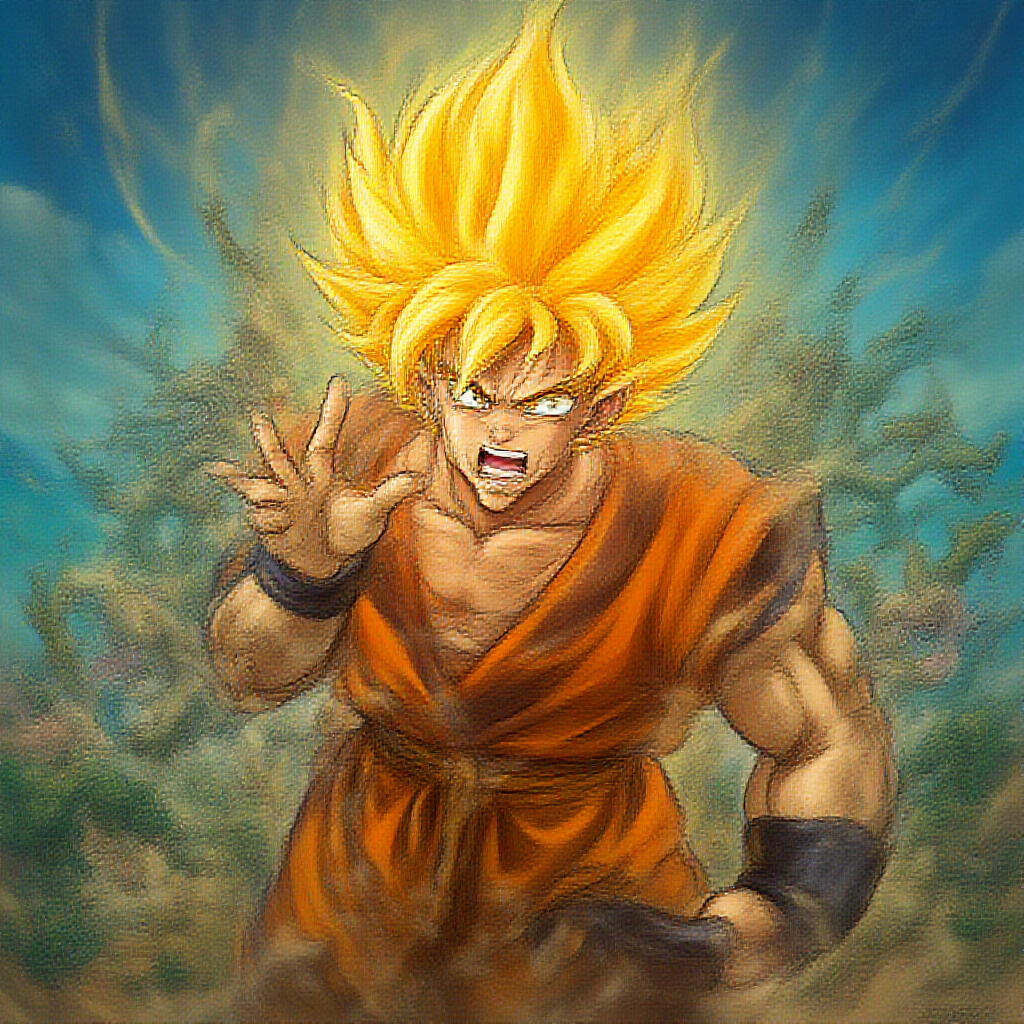 A highly detailed image of Goku set against a mystical Dragon Ball-inspired landscape, in the signature style of Akira Toriyama. The artwork features a vibrant and dynamic composition, showcasing Goku in an action pose with his iconic Super Saiyan form, golden hair radiating energy, and intense determination in his eyes. The background includes swirling clouds and distant dragon motifs, adding to the epic atmosphere. Precisionist art techniques highlight the intricate textures of Goku's gi and muscular form, while capturing the essence of a powerful hero in the expansive world of Dragon Ball. The image is rendered in ultra-high definition, emphasizing vibrant colors and fine details to bring the legendary character to life.