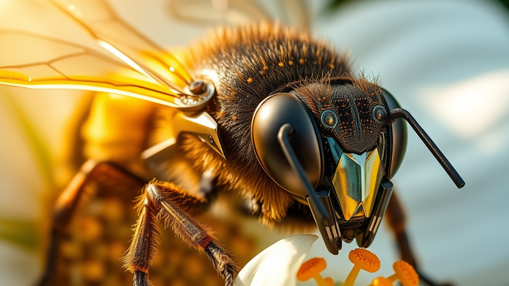 A highly detailed macro photograph captures the portrait of a futuristic robotic bee, its metallic exoskeleton glistening under the soft sunlight. Tiny gears and intricate circuits are visible beneath its transparent wings, which are dusted with vibrant granules of pollen in shades of bright yellow and deep orange. The bee's multifaceted, camera-like eyes reflect a kaleidoscope of colors, hinting at advanced optics. Surrounding it, delicate flower petals provide a natural contrast to the bee's artificial design, blending the boundary between nature and technology.