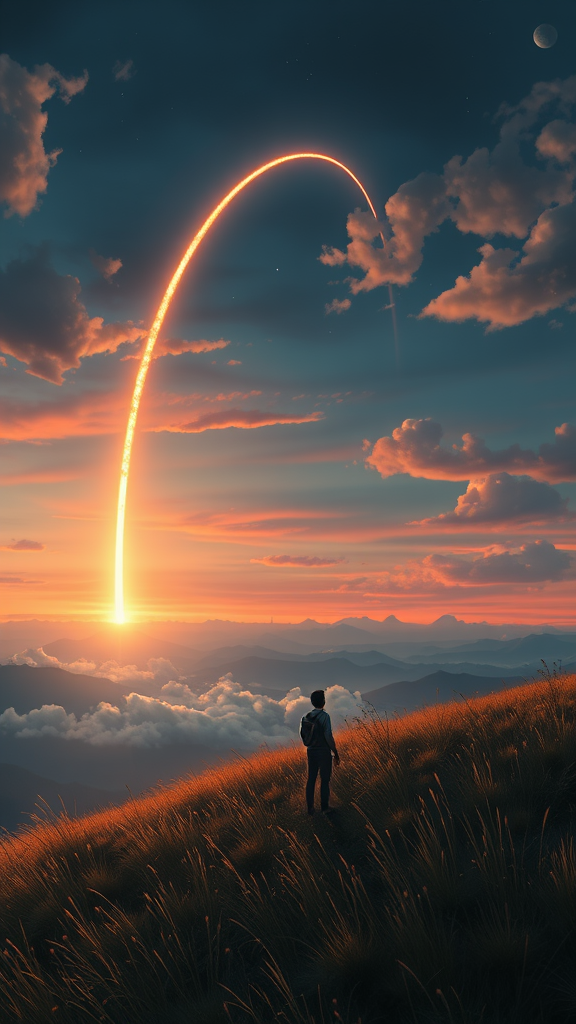 A highly detailed matte painting of a man standing on a hill, gazing at a rocket launch on the horizon. The scene is infused with a sense of wonder, reminiscent of Studio Ghibli and Makoto Shinkai's storytelling, enriched by the artistic flair of Artgerm, WLOP, and Greg Rutkowski. The landscape is detailed and vivid, with volumetric lighting creating an ethereal glow around the rocket's trail. The artwork is rendered in high resolution with precision akin to octane render, capturing the imagination and allure of space exploration. The sky is a cascade of colors, transitioning from deep blues to fiery oranges as the rocket ascends. The man's silhouette is thoughtfully integrated into the scene, conveying both solitude and awe. The attention to detail is evident in the textures of the grassy hill, the wisps of smoke trailing the rocket, and the atmospheric depth of the background, ensuring a composition that speaks to the art community’s admiration for a timeless masterpiece.
